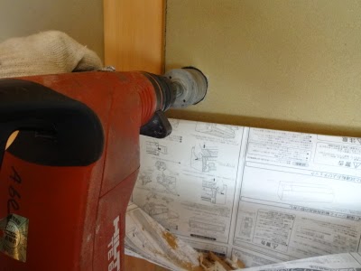 室内機を吊る吊りボルトの位置が違うため、新たにアンカーを打ち直し、吊りボルトを設置。